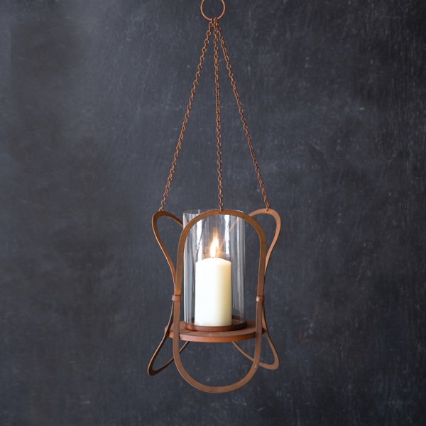Adorn your patio with the rustic, primitive nature of this open hanging lantern. Wonderful for cookouts or sitting on the deck at night, this lantern will bring many warm smiles. Item features a rusty finish. Chimney is 5'' dia.
