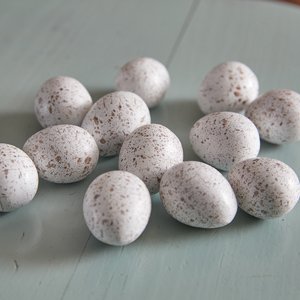 These sweet quail eggs could be used in an Easter display or in a found nest to enjoy all year long. These eggs have a life-like finish and are made of resin. Twelve eggs come in a polyfoam container.
