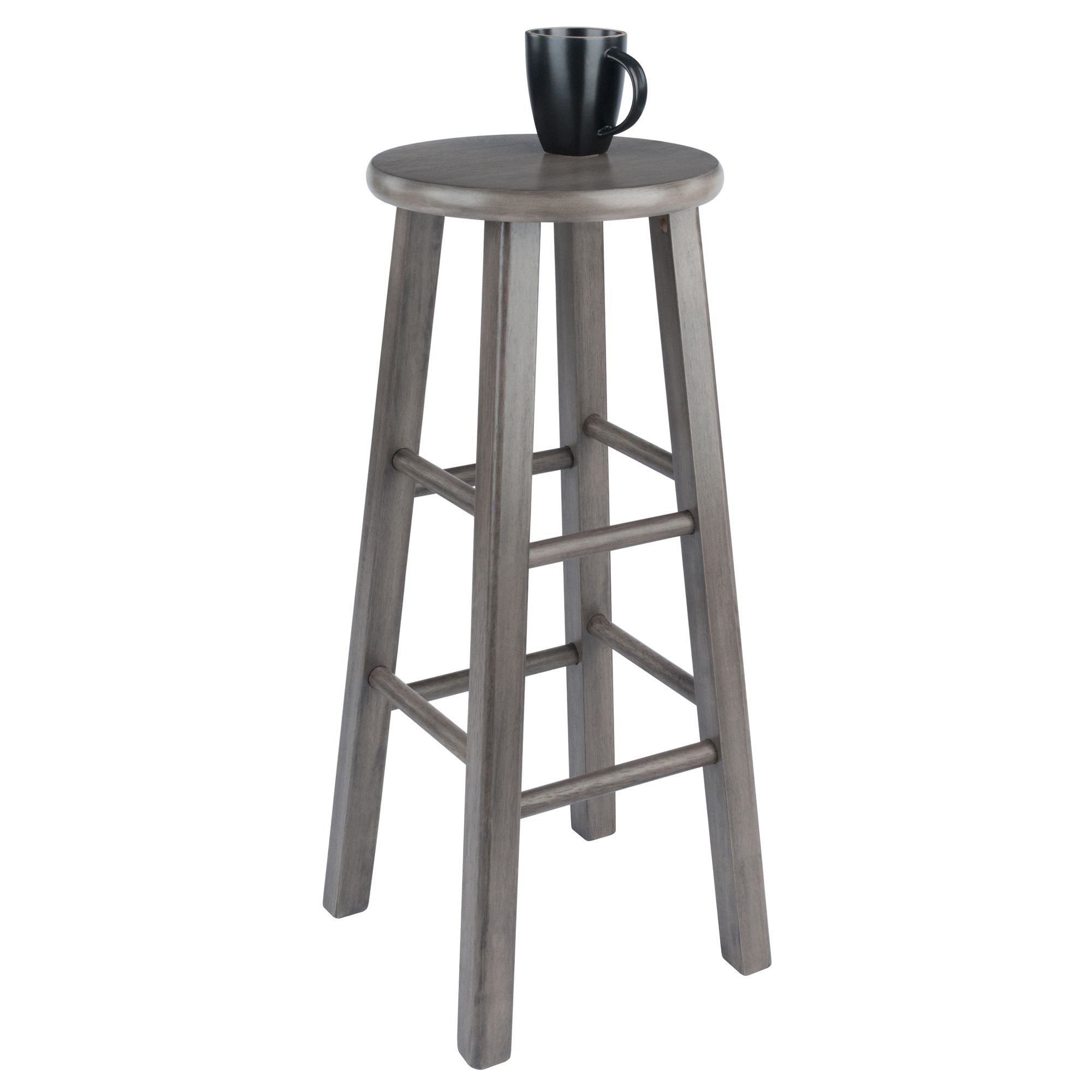 Bring a little farmhouse to your den; kitchen or family room seating area with the versatile Winsome Wood Ivy Bar Stool. The weathered finish brings out the warm; handcrafted feel of the solid wood and will look right at home with either contemporary or country decor. Featuring high and low crossbars on all four sides; for stability and comfort making this stool not only attractive but also very functional. The already assembled; square legs and 12.75' round seat have a sturdy built and hold a static weight of 220lbs. Ideal for extra seating when company comes over; pull up a stool then set it aside and use as a stand. The simple but still appealing rustic edge of this stool allows it to be used as a side piece to display a small plant; lanterns; or a vase. The Winsome Ivy collection is available in other rustic finishes and like most Winsome stools it’s available in both bar and counter height. Conveniently packed and shipped in one box and is ready to use; no assembly is required.