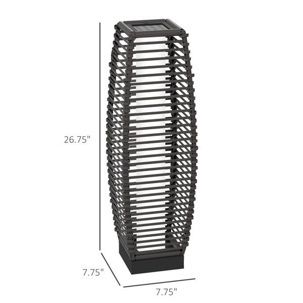 ●   Decorative Rattan Solar Garden Light Info: Overall Dimensions: 7.75" W x 7.75" D x 26.75" H. Solar Light Panel: 4.75" W x 4.75" D. Waterproof Rating: IP44.  Charge Time: 5 hours in sufficient sunlight.  Use Time (When Fully Charged): 8 hours.