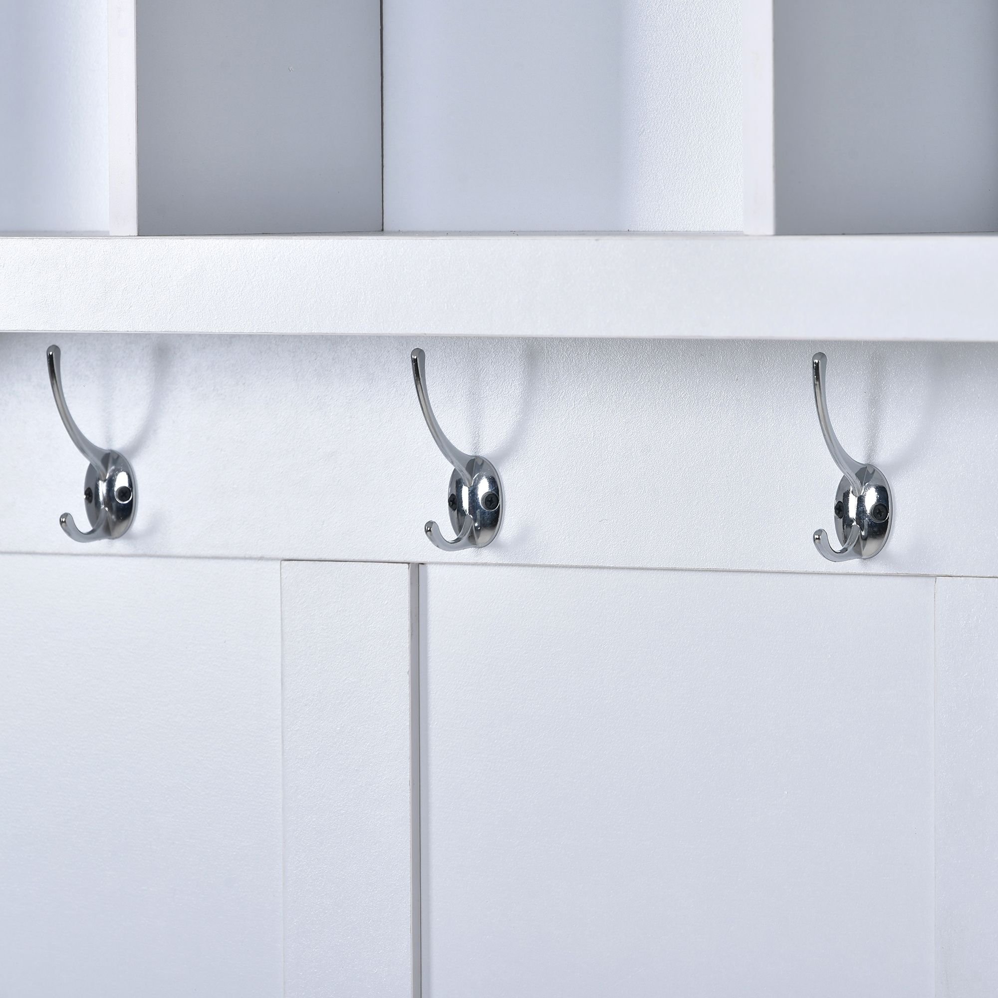 A tidy,organized entryway sets the tone when walking into your home, and this modern farmhouse hall is just the thing for both stylish home and functional organization. The lower compartments feature 2 adjust shelves, creating six spacious areas that are flexible enough to accommodate all kinds of items,large and small. Whether you're stowing tall boots or small sandals,these open shelves have you covered. The open area above the lower storage is a perfect spot to sit and pull on your shoes and jacket. Above the open bench are four double-pronged hooks for hanging coats,scarves,dog leashes, and so mach more,there are also hooks on the side of the hall tree.