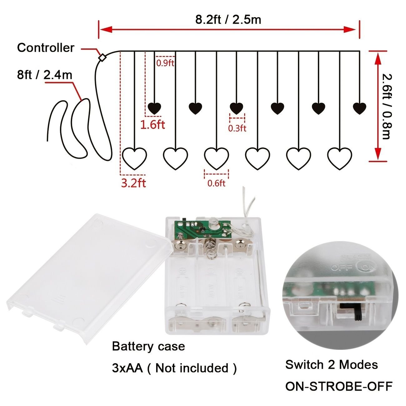 Heart Shape Light(Warm White)Material: strong copper wireLED Type:138 led lights in total. There are 12 heart pendants.The small heart have 10 cm in diameter and the droop lengthis 60cm; the larger heart has 20cm in diameter and the striplength is 90cm. TLighting mode:8 flash mode: Combination; Waves; Sequential; Slo-glo; Chasing/Flash; Slow Fade; Twinkle/Flash; Steady OnPower: 3*AA(Exclude) or Insert USB interface.whether indoor or outdoor; you can choose any method conveniently.
