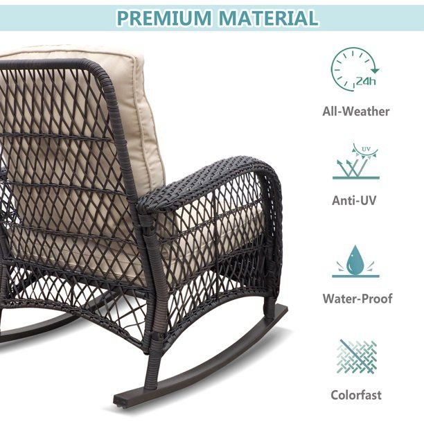 Enjoy a relaxing moment on the patio or in the yard with outdoor porch rocking chair. This Wicker rocking chair is made from High-quality Resin Wicker; all-weather cushions with a sturdy rust-resistant steel frame that's easy to assemble and is designed to be water-resistant.