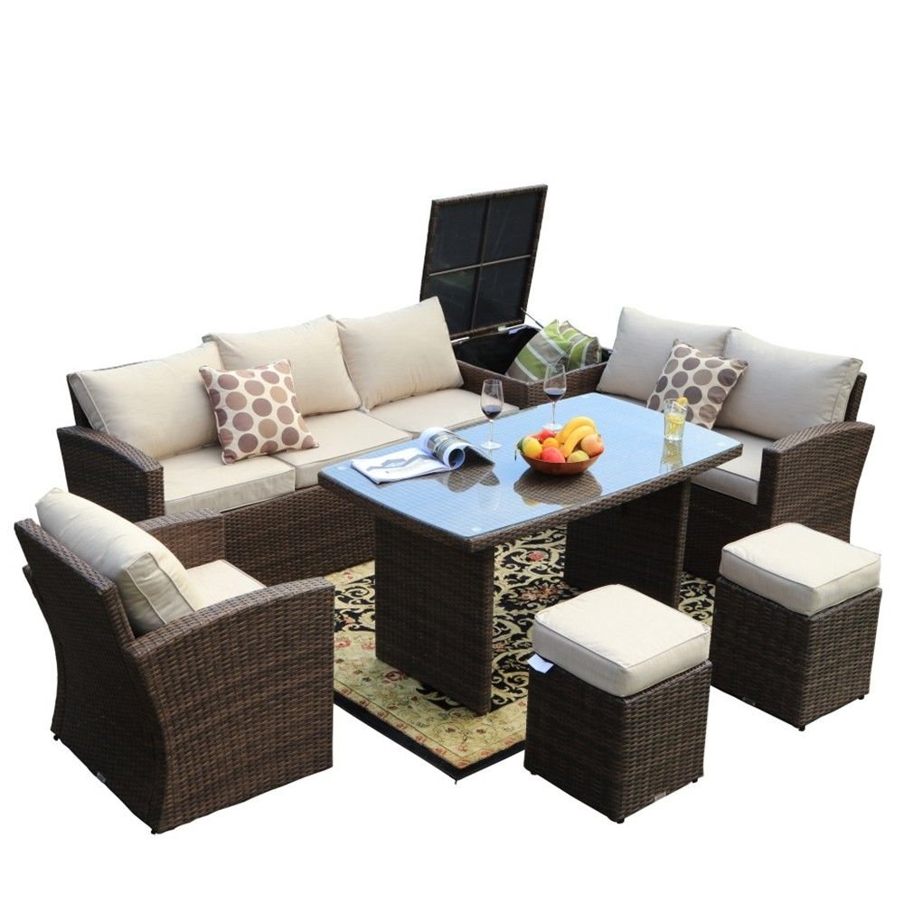 -This patio furniture set is woven by hand of Commercial Grade all-weather wicker strands; and then wrapped around a sturdy yet lightweight steel frame. The table comes with a removable tempered glass adding a sophisticated touch and allowing you to place drinks; meals; or decorative items on top. 1 three-seat sofa 1 double sofa 1 single sofa are all thick lofty sponge padded for more comfort and relaxation. You'll appreciate its beauty and durability as well as your guests' compliments on it! Our wicker is strong and durable but also light weight at the same time. Repositioning the set is easy and convenient so you can easily change your set's configuration at any time.