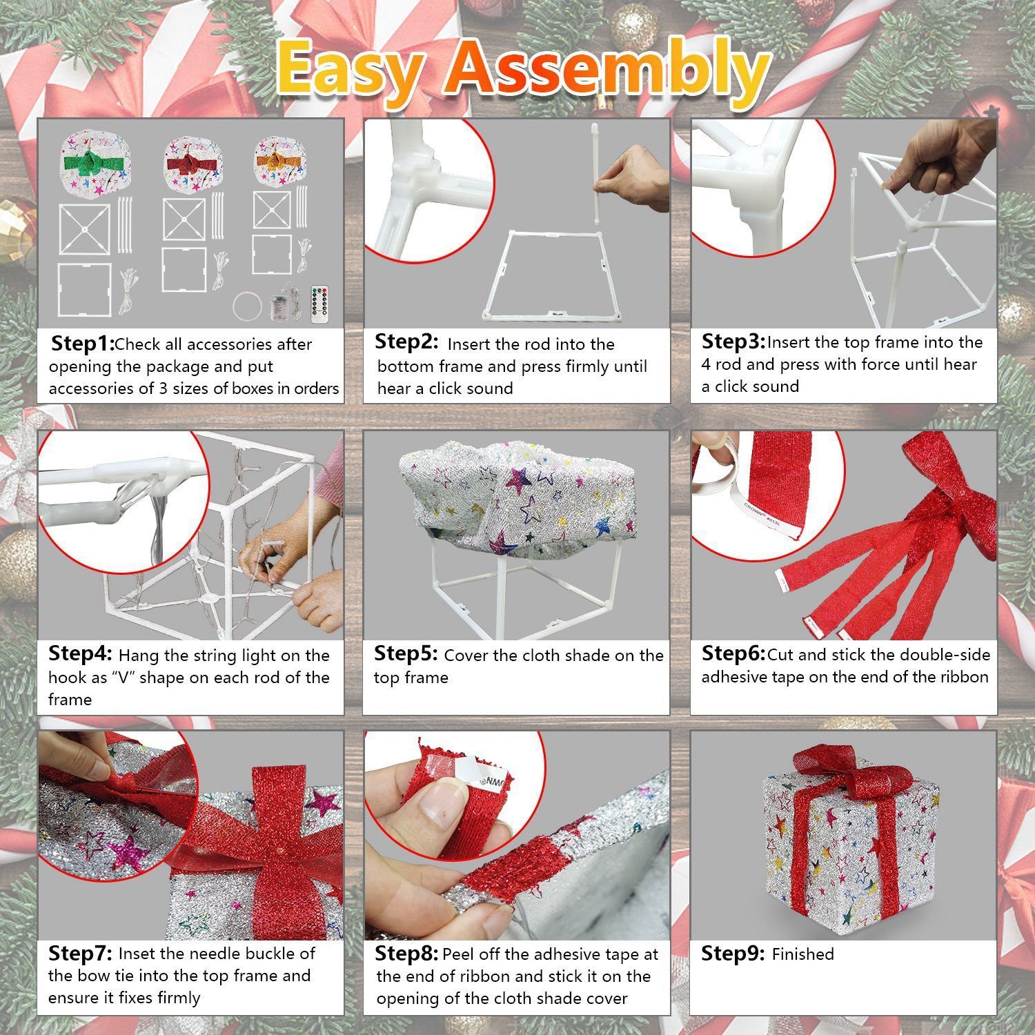 *Easy Setup & Stacking Design*:Simply connect all rods,cover with the shade,attach the ribbon and bow,connect the light string together,and put into 3Pcs AA batteries(Not Included) for usage. When not in use,just put the small box and medium box into the large box for quick and space-saving storage.