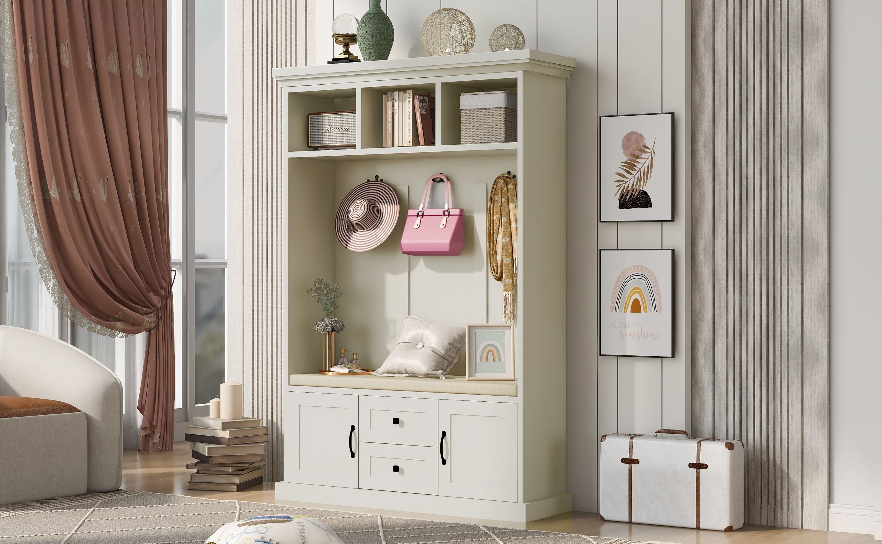 Classic details give our Storage Locker a traditional look, but clean lines and a modern finish bring this hall tree into the now. Generous, sweeping crown molding accents the top of the case; 3-open cubbies lie below it, awaiting your display items, books, accessories and more. The open area beneath the cubbies features elegant beaded-board paneling, 3-double hooks for coats and bags, and a comfortable seat with cushion. The grand finale of this mudroom storage piece, 2-drawers and 2-doors that allow you to store away even more necessitie.