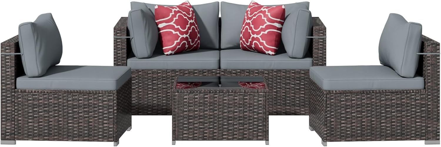 Home > 5 Pieces Outdoor Patio Furniture Set, Wicker Patio Conversation Sectional Sofa Set, All Weather PE Rattan Sofa with Glass Table and Cushions